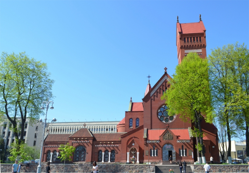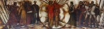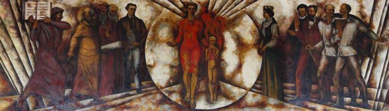 В центре росписи – огромное солнце, как око взирает на нас. Внутри солнца – мать Беларусь со своим сыном, как Богородица с младенцем. Вокруг них – белорусские просветители. Слева - темные страницы истории, война, справа - светлое будущее. Именно аналогия с библейскими мотивами в свое время чуть не помешала Гавриилу Харитоновичу реализовать эту роспись. Одна высокопоставленная особа, чья подпись нужна была для окончательной приемки, сказала, что проект хороший, но подпись будет только после всех остальных членов комиссии.